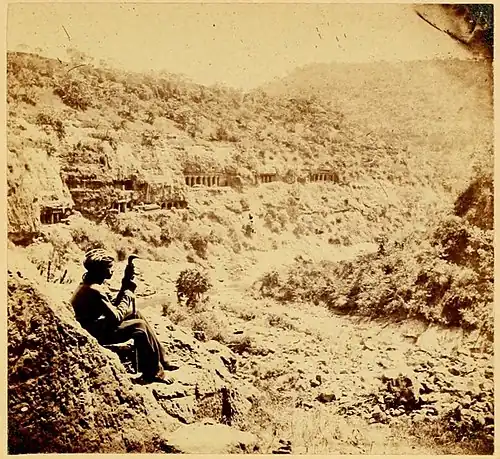 THE lower or northern group of Caves, extending from the two older Chaitya caves seen in the last view to the commencement of the series. The first Cave on the left of the picture is that known as No. 7. Next to it is the two-storied cave numbered as 6. No. 4 is seen on the same level as its lower storey, and on the level of its upper storey are seen the three magnificent Viharas known as Nos. 1, 2, and 3.