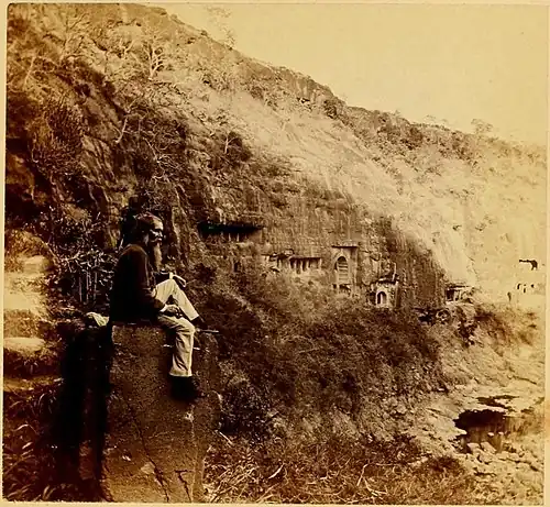 A LARGER view of the oldest or central group, comprising the two Chaitya Caves, Nos. 9 and 10, and interesting as explaining why this spot was chosen for the earliest excavation. As is seen from the picture, the rock here is smoother and more perpendicular than anywhere else, and carries its smoothness down almost to the bottom of the ravine. To the right and left the platform of rock rises considerably, and the Caves are situated on a ledge, which was probably broader in former times, but is now hardly passable in places. It is only by getting on the terrace at this point that the outer excavations are reached. Apparently, there never was any other ascent to any of the Caves but at this spot.