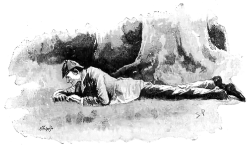 buffalo, and wallowed all over it. Here is where the party with the lodge-keeper came, and they have covered all tracks for six or eight feet round the body. But here are three separate tracks of the same feet." He drew out a lens, and lay down upon his waterproof to have a better view, talking all the time rather to himself than to us. "These are young McCarthy's feet. Twice he was walking, and once he ran swiftly so that the soles are deeply marked, and the heels hardly visible. That bears out his story. He ran when he saw his father on the ground. Then here are the father's feet as he paced up and down. What is this, then? It is the butt-end of the gun as the son stood listening. And this? Ha, ha! What have we here? Tip-toes! tip-toes! Square, too, quite unusual boots! They come, they go, they come again—of course that was for the cloak. Now where did they come from?" He ran up and down, sometimes losing, sometimes finding the track until we were well within the edge of the wood, and under the shadow of a great beech, the largest tree in the neighbourhood. Holmes traced his way to the further side of this, and lay down once more upon his face with a little cry of satisfaction. For a long time he remained there, turning over the leaves and dried sticks, gathering up what seemed to me to be dust into an envelope, and examining with his lens not only the ground, but even the bark of the tree as far as he could reach. A jagged stone was lying among the moss, and this also he carefully examined and retained. Then he followed a pathway through the wood until he came to the high road, where all traces were lost.