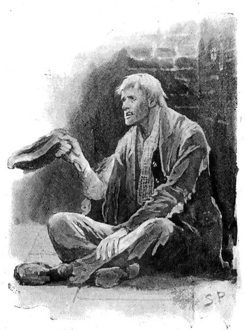 for the sinister cripple who lives upon the second floor of the opium den, and who was certainly the last human being whose eyes rested upon Neville St. Clair. His name is Hugh Boone, and his hideous face is one which is familiar to every man who goes much to the City. He is a professional beggar, though in order to avoid the police regulations he pretends to a small trade in wax vestas. Some little distance down Threadneedle-street upon the left hand side there is, as you may have remarked, a small angle in the wall. Here it is that the creature takes his daily seat, cross-legged, with his tiny stock of matches on his lap, and as he is a piteous spectacle a small rain of charity descends into the greasy leather cap which lies upon the pavement beside him. I have watched the fellow more than once, before ever I thought of making his professional acquaintance, and I have been surprised at the harvest which he has reaped in a short time. His appearance, you see, is so remarkable, that no one can pass him without observing him. A shock of orange hair, a pale face disfigured by a horrible scar, which, by its contraction, has turned up the outer edge of his upper lip, a bull-dog chin, and a pair of very penetrating dark eyes, which present a singular contrast to the colour of his hair, all mark him out from amid the common crowd of mendicants, and so, too, does his wit, for he is ever ready with a reply to any piece of chaff which may be thrown at him by the passers-by. This is the man whom we now learn to have been the lodger at the opium den, and to have been the last man to see the gentleman of whom we are in quest."