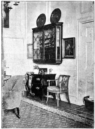 A door opens to a small corridor of white enamel. This is one of the most interesting corners of the house. One side—along which the windows run—is devoted to old military pictures, of which Lord Wolseley has a very choice collection. Here, too, are many of the playbills of performances given by the French Zouaves in the Crimea. The opposite side contains an excellent library, whilst in the spare spaces are