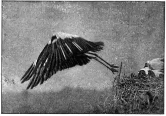 The fact being understood that instantaneous photographs are not altogether new things, the further fact must be admitted that during the later years of the reign of the dry plates great things have been done in carrying this quick work nearer perfection, and the apparatus and material now available render possible feats startling enough to bring good Monsieur Daguerre from his grave. To photograph a bird actually upon the wing is an achievement to the point of which neither he nor any of his early fellow-labourers upon sunlight brought his work. Nevertheless, we print a reproduction of such a photograph on this very sheet of paper. The picture is the work of Herr Ottomar Anschütz, of Lissa, in Prussia, a gentleman who has carried instantaneous photography to its furthest at present. The stork as he appears leaving his nest is not imposing as a model of winged grace, and exhibits a curious humped and headless appearance which no artist would dare to give him on canvas. This, indeed, is one of the great aims of this quick work; it gives us surprising evidence as to the real