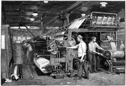 But before any printing takes place, the paper, in great rolls of more than two miles long, must be re-wound, and for this a special winding machine is provided, whereon the paper unwinds from its original roll and forms another. This liberates the electricity with which new paper is usually highly charged, and which hinders and interferes with accuracy of the folding; it also facilitates the detection and cutting out of the inevitable faulty joins in the paper. Much depends on the paper, and great care is requisite in its use; it is often found that different reels of, to all appearance, exactly the same make of paper, for unaccountable reasons, produce entirely different results, good and bad.