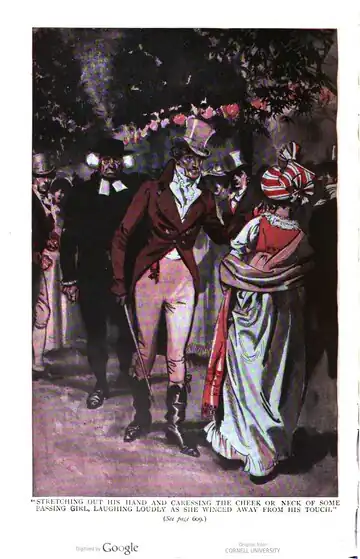 "Stretching out his hand and caressing the cheek or neck of some passing girl, laughing loudly as she winced away from his touch."