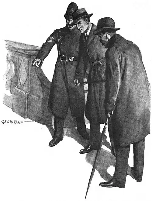 "It took some violence to do that," said Holmes thoughtfully. With his cane he struck the ledge several times without leaving a mark. "Yes, it was a hard knock. In a curious place, too. It was not from above but from below, for you see that it is on the lower edge of the parapet."