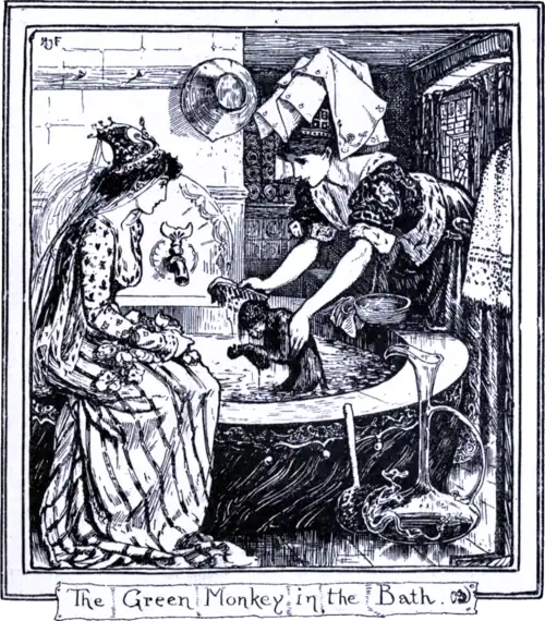 At these words the sleeper awoke, and lost no time in rising and hurrying to the garden, where she found all as the Good Queen had described. Then she hastened to rouse her daughter and together they prepared the bath, for they would not let their women know what they were about. Zayda gathered quantities of roses, and when all was ready they put the monkey into a large jasper bath, where the mother rubbed him all over with the green liquid.