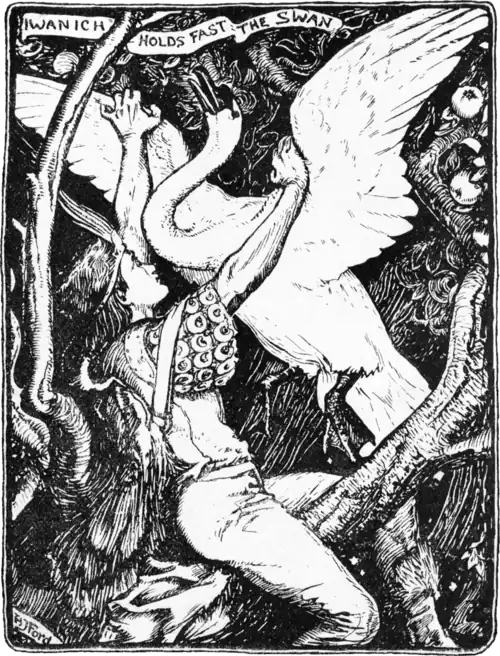 At midnight a gentle west wind shook the tree, and at the same moment a snow-white swan-like bird sank down gently on his breast. The Prince hastily seized the bird’s wings in his hands,