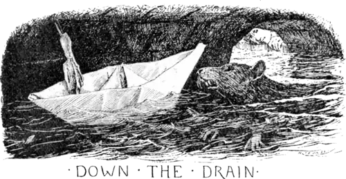 So they made a little boat out of newspaper, put the Tin-soldier in it, and made him sail up and down the gutter; both the boys ran along beside him, clapping their hands. What great waves there were in the gutter, and what a swift current! The paper-boat tossed up and down, and in the middle of the stream it went so quick that the Tin-soldier trembled; but he remained steadfast, showed no emotion, looked straight in front of him, shouldering his gun. All at once the boat passed under a long tunnel that was as dark as his box had been.