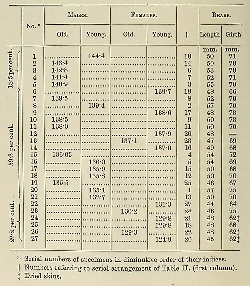 Very little positive value should be attached to the girth measurements taken at the base of the beaks, as may be inferred by a consultation of the columns devoted to these on Table II., which may be noticed particularly in the case of the three dry skin specimens distinguished from the others by an asterisk, and mentioned before. They prove in a striking manner that considerable shrinkage takes place on drying out, which, if ignored when admitting this measurement for a comparison of fresh with cabinet specimens, may lead to erroneous deductions.