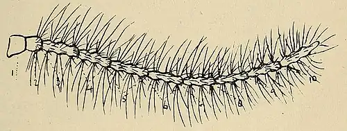[Mr. Green appears to be quite correct in his contention on this point, as may be seen from the above figure, and from microscopical examination made since the receipt of his letter. I had unquestionably followed the opinions of very high authorities. Latreille ('Le Règne Animal,' tome v. p. 232 (1829)), who appears to have been the first to give a diagnosis of the genus, which he writes "Monophleba," refers to a species from Java, "remarquable par ses antennes, composées d'environ vingt-deux articles." Burmeister ('Handbuch der Entomologie,' ii. p. 80 (1835)) describes the males of Monophlebus as having up to twenty-five joints. Westwood, who paid much attention to the genus ('Vigors' Zool. Journ.' v. p. 452 (1835)), describes the antennæ of the male of one species as "26 articulatæ." Recently Dr. Sharp ('Cambridge Nat. Hist.' vol. vi. p. 539 (1899)) has described the maximum number of antennal joints in some males as about twenty-five. The issue rests on the method of morphological interpretation, and Mr. Green has done a very useful service.—Ed.]