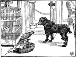 The parrot made a droll use of these practisings, turning to account his knowledge of speech in the slyest way. If he found himself alone with the poodle, who was perhaps comfortably stretched on her cushion, Lori would cry—imitating his master’s voice—as if he quite understood the joke: ‘Go out!’ Poor Patti would get