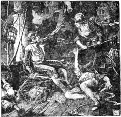 Daylight discovered the little ‘Revenge’ a mere water-logged hulk, with rigging and tackle shot away, her masts overboard, her upper works riddled, her pikes broken, all her powder spent, and forty of her best men slain.