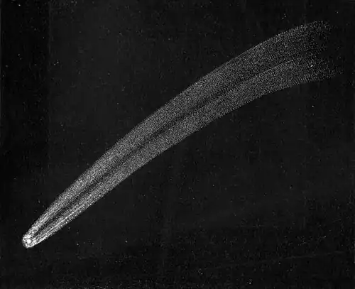 so that its proportions were seen without foreshortening. Its situation in the latter part of its course afforded also a fair sight of the curvature of the train, which seems to have been exhibited with unusual distinctness, contributing greatly to the impressive effect of a full-length view." This comet, though surpassed by many others in size, has not often been equalled in the intense brilliancy of its nucleus,