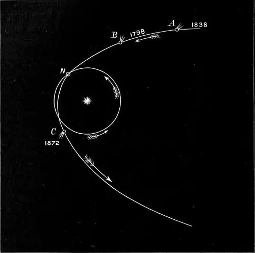 orbit. The conclusion now seems recognised as inevitable that Biela's Comet has ceased to exist as a concrete body. What has just been stated appears, however, to be only a portion of the truth, for showers of Andromedes seen in 1798, 1830, and 1838 would seem to have preceded Biela's Comet along its track at different distances varying between 1/20th and 1/3rd of a circuit.