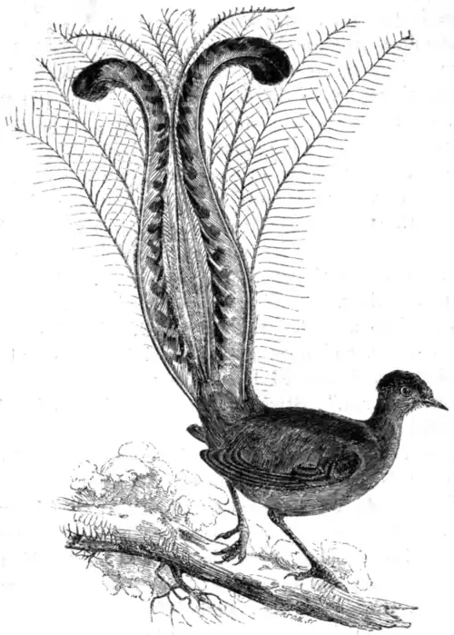 "I was awakened," writes Mr. Hawdon, "at sunrise by the singing of numerous pheasants. These are the mocking-birds of Australia, imitating all sounds that are heard in the bush in great perfection; they are about the size of a small fowl, of a dirty brown colour, approaching to black in some parts; their greatest attraction consists in the graceful tail of the cock bird, which is something like a lyre. But little is known of their habits, for it is seldom they are found near the dwellings of civilised man.