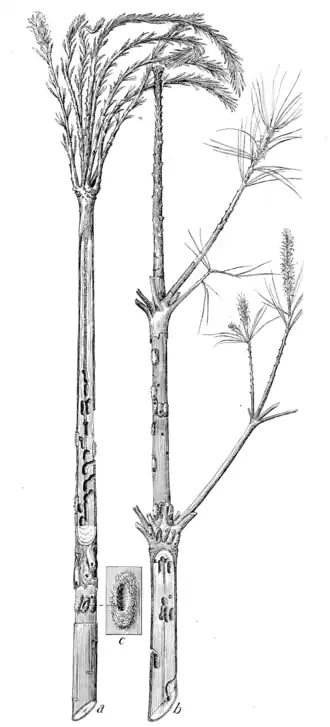 Fig. 3.—Work of white-pine weevil, showing character of injury, chip cocoons, and pupal cells: a. Vigorous terminal shoot, showing condition of new growth at time pupæ are transforming to adults; b. 3-year-old top, showing how larvæ have migrated from terminal to the 2 and 3 year old internodes; c. chip cocoon and pupal cell, natural size. (Original.)
