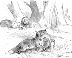 A Lion and a Bear seized upon a kid at the same moment, and fought fiercely for its possession. When they had fearfully lacerated each other, and were faint from the long combat, they lay down exhausted with fatigue. A Fox, who had gone round them at a distance several times, saw them both stretched on the ground, and the Kid lying untouched in the middle, ran in between them, and seizing the Kid, scampered off as fast as he could. The Lion and the Bear saw him, but not being able to get up, said, "Woe betide us, that we should have fought and belaboured ourselves only to serve the turn of a Fox!"