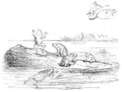 The Frogs, grieved at having no established Ruler, sent ambassadors to Jupiter entreating for a King. He, perceiving their simplicity, cast down a huge log into the lake. The Frogs, terrified at the splash occasioned by its fall, hid themselves in the depths of the pool. But no sooner did they see that the huge log continued motionless, than they swam again to the top of the water, dismissed their fears, and came so to despise it as to climb up, and to squat upon it. After some time they began to think themselves ill-treated in the appointment of so inert a Ruler, and sent a second deputation to Jupiter to pray that he would set over them another sovereign. He then gave them an Eel to govern them. When the Frogs discovered his easy good-nature, they yet a third time sent to Jupiter to beg that he would