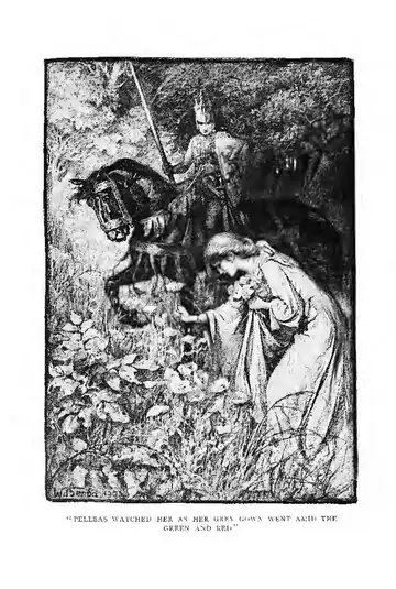 "PELLEAS WATCHED HER AS HER GREY GOWN WENT AMID THE GREEN AND RED"