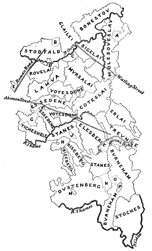 Note.—The area of Burnham Hundred that is partially enclosed by areas N, O and P should also have been marked off by dotted lines in such a way as to divide the hundred into two completely detached parts, this area being that of Beaconsfield which is not named in Domesday Book.