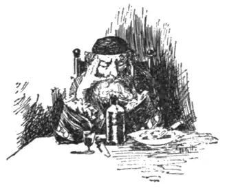 Rabbi Remorse Red-herring silently pushed his plate away, and leaned his elbows upon the table and his face upon his palms, and his chin upon the bottle of schnapps in mournful meditation.