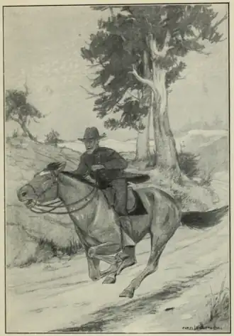 On, on the Kentucky thoroughbred galloped. With each passing mile, the General expected to see him slow down. But he did not. Never had the great man strode such a horse. His gait was so easy and so swift it was a joy to the soldier to feel the cold morning wind cut his face and to see the trees and fences rush by. Seven miles, eight, nine, and ten were passed. They were now at the village of Hastings, just half way to Pine River. The General again looked at his watch. Ten miles in twenty-seven minutes. It was incredible. Was it wise to let this willing horse run so fast? But the need was great and Palo'mine showed no signs of slackening. So the General gave him the rein and they flew onward.