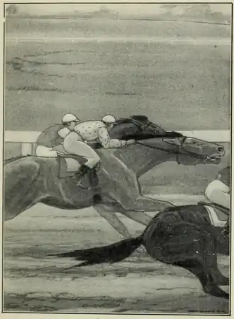 The Jockey again looked back at Halsey, and with a sudden sideward movement of his quirt struck Palo'mine across the face. He did it so cleverly that the crowd thought he had intended to strike his own horse, but Halsey knew better and his blood boiled, yet he would fight fair. So he pulled Palo'mine a little to one side in which effort he lost the half length which he had gained, but it was soon regained and another half length with it, so they were running neck to neck at the three-quarters post.