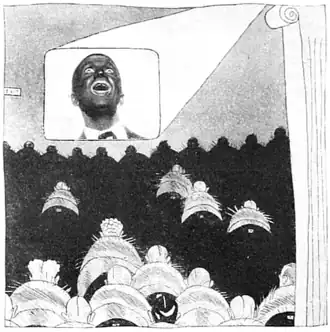 Seemingly resentful that they were no longer to provide necessary sound effects, part of the audience had armed themselves with whistles, cow-bells, inflated paper bags, and every noise-making device within their resources. The lights went out; the audience became hushed in anticipation. A girl appeared on the screen and began to sing. With the first note, bedlam broke loose—bells, whistles, bicycle sirens, bursting bags, and the rhythmic clap-clap-clap of disapproval of the short subject. No one knew what song she sang. They had come to scoff and were scoffing. Not a note was heard above the confusion.
