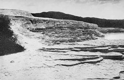 The White Terrace had a fountain of azure-blue hot water ninety feet in diameter, which sometimes spouted ten or fifteen feet high. When the south wind blew briskly it could be safely entered to a depth of thirty feet, its beautifully encrusted crater meanwhile remaining empty until the wind changed. Then, roaring all the while, it filled at the rate of three or four feet an hour, and when within a few inches of the rim often shot a column of water to a height of sixty feet.