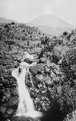 Chief of the mountains in this park is Ruapehu, the North Island's highest elevation. The highest of its three main peaks is 9175 feet. At all times glaciers cover its upper slopes, but for three months each year it is scaled by parties of New Zealanders with comparative ease. Although Ruapehu is known to the Maoris as the Snow Mountain, it has within its snow-fields a spouting crater lake which at times is very active. This lake is five hundred feet in diameter and lies three hundred feet below the crater lip, between icy cliffs that can be descended only with the aid of ropes. Years ago an eruption of this slaty-colored tarn caused the formation of hot springs on its shores. In 1911 black and yellow mud poured into it from a vent in its walls, and later there was an eruption of red earth in the lake's centre, and at the same time black ash dust was thrown from the crater.