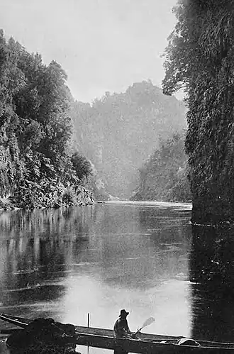 The river has its source near the base of Tongariro, and for the greater part of its length flows through a deep gorge with lichen-draped cliffs and higher, forested slopes. Between Taumarunui and the mouth, one hundred and fifty miles, the river falls five hundred feet; in its steepest part the fall is fifteen feet in twelve chains. There are many rapids, and in passing through these the voyager has exciting moments.