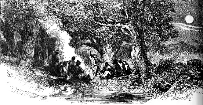 Our fire on the turf, and our tent 'neath a tree—Carousing by moonlight, how merry are we!Let the lord boast his castle, the baron his hall;But the house of the Gipsy is widest of all.We may shout o'er our cups, and laugh loud as we will,Till echo rings back from wood, welkin, and hill;No joys seem to us like the joys that are lentTo the wanderer's life and the Gipsy's tent.