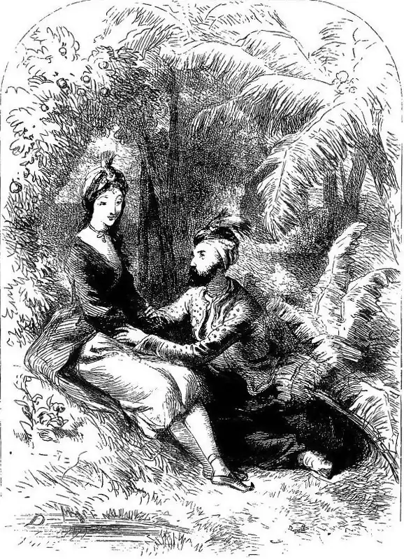 Beneath, calm Cashmere's lovely vale1Breathed perfumes to the sighing gale;The amaranth and tuberose,Convolvulus in deep repose,Bent to each breeze which swept their bed,Or scarcely kissed the dew, and fled;The bulbul, with his lay of love,2Sang, 'mid the stillness of the grove;The gulnare blushed a deeper hue,3And trembling shed a shower of dew,Which perfumed, ere it kissed the ground,Each zephyr's pinion hovering round;The lofty plane-tree's haughty brow4Glittered beneath the moon's pale glow;And wide the plantain's arms were spread,5The guardian of its native bed.