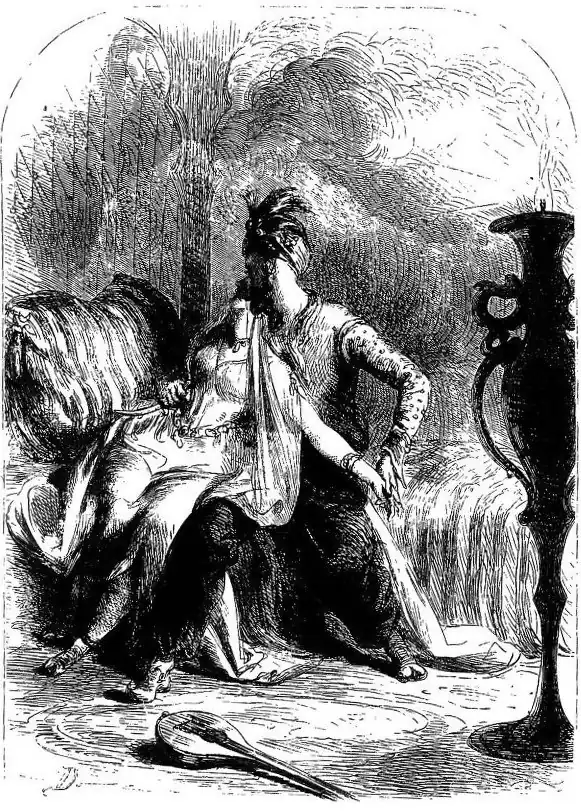 Beneath her veil a light is beaming,A dagger in her hand is gleaming,And livid was the light it threw,A pale, cold, death-like stream of blue,Around her form of angel brightness,And o'er her brow of marble whiteness!