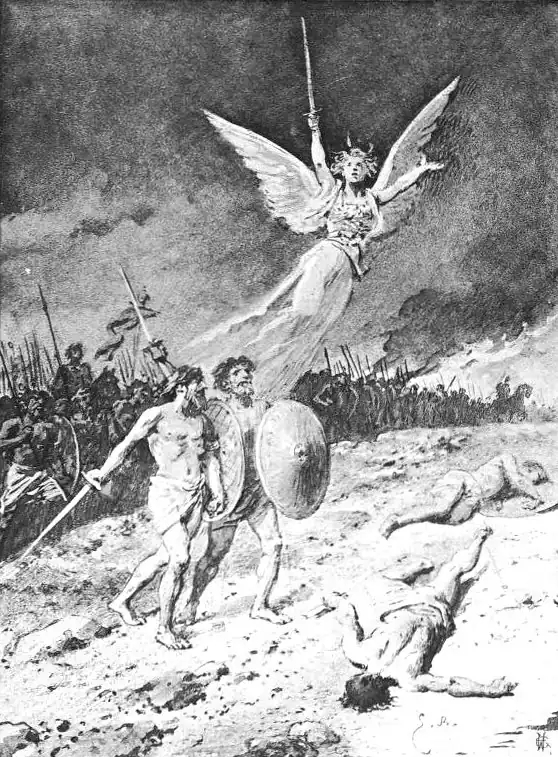 LD as the world—no other things so old:Nay, older than the world, else, how had sprungSuch lusty strength in them when earth was young?—Stand valor and its passion hot and bold,Insatiate of battle. How, else, toldBlind men, born blind, that red was fitting tongueMute, eloquent, to show how trumpets rungWhen armies charged and battle-flags unrolled?Who sings of valor speaks for life, for death,Beyond all death, and long as life is life,In rippled waves the eternal air his breathEternal bears to stir all noble strife.Dead Homer from his lost and vanished graveKeeps battle glorious still and soldiers brave.