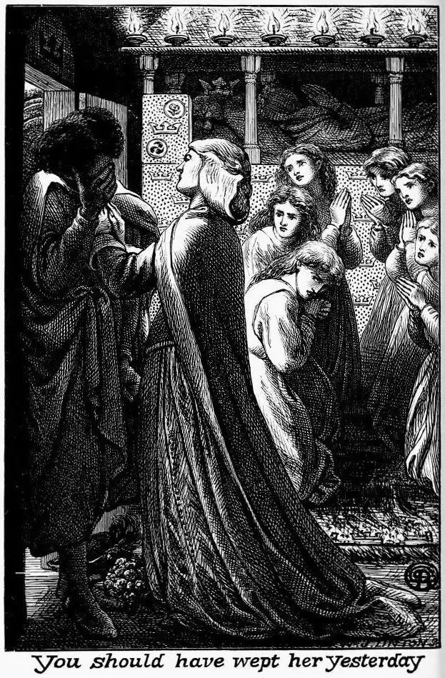 "By her head lilies and rosebuds grow; The lilies droop, will the rosebuds blow?The silver slim lilies hang the head low; Their stream is scanty, their sunshine rare: Let the sun blaze out, and let the stream How, They will blossom and wax fair."