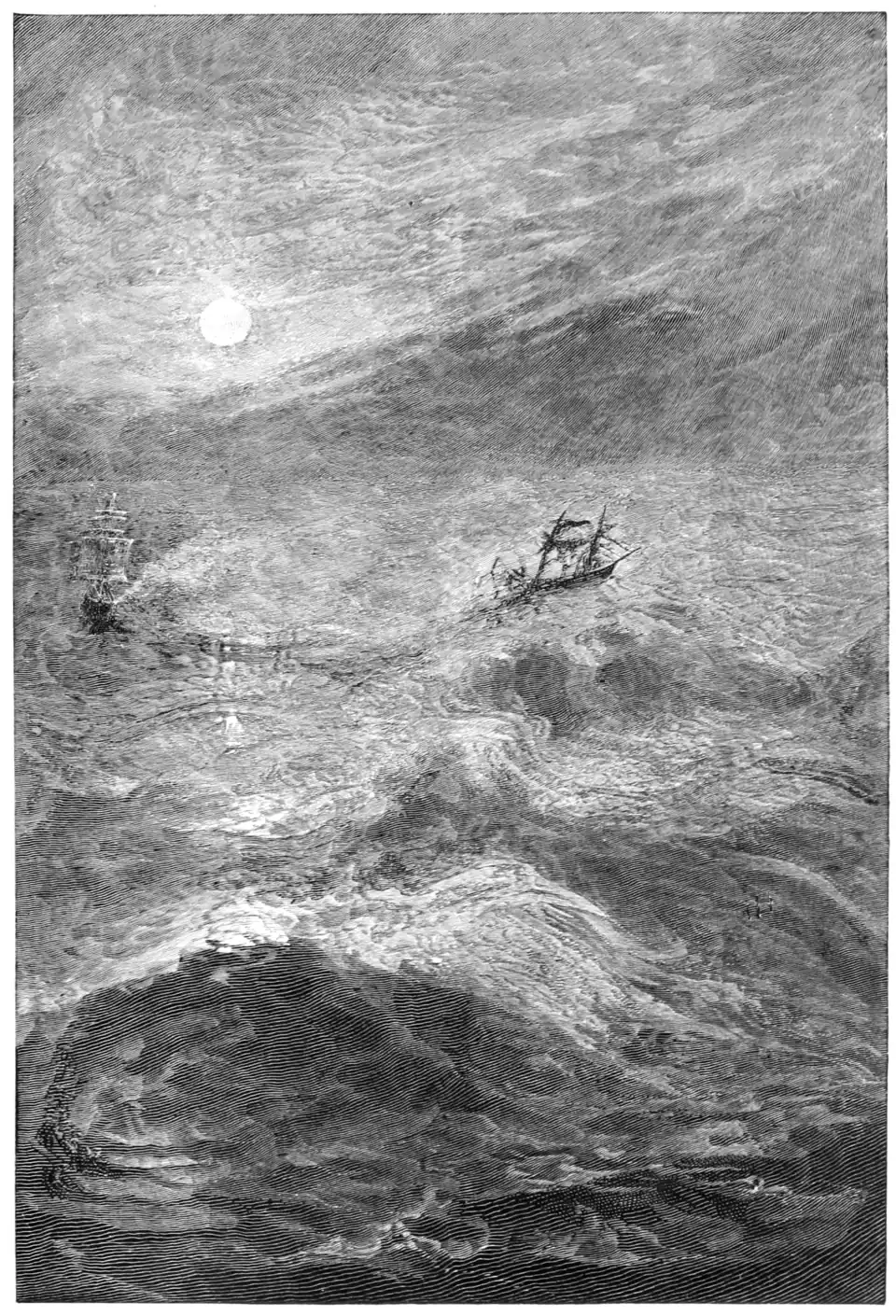 Beneath the low-hung night cloudThat raked her splintering mast,The good ship settled slowly,The cruel leak gained fast.******And ship to ship made signals,Man answered back to man,While oft, to cheer and hearten,The Three Bells nearer ran.The Three Bells.
