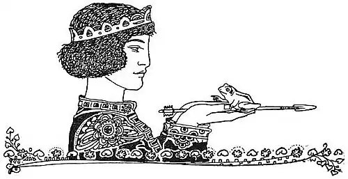 But the youngest prince's arrow shot through a green wood, and fell into a lake. He saw his arrow floating among the reeds, and a frog sitting thereon, looking fixedly at him.
