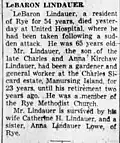 LeBaron Lindauer, a resident of Rye for 54 years, died yesterday at United Hospital, where he had been taken following a sudden attack. He was 65 years old. Mr. Lindauer, the son of the late Charles and Anna Kirchaw [sic] Lindauer, had been a gardener and general worker at the Charles Sicard estate, Manursing Island, for 23 years, until his retirement two years ago. He was a member of the Rye Methodist Church. Mr. Lindauer is survived by his wife Catherine H. Lindauer, and a sister, Anna Lindauer Lowe, of Rye.