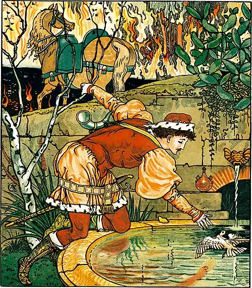 At this terrible scene he descended, and more than once gave himself up for lost. As he approached this great fire he was ready to die with thirst; and perceiving a spring falling into a marble basin, he alighted from his horse, approached it, and stooped to take up some water in the little golden vase which he had brought with him, when he saw a turtle-dove drowning in the fountain. Cheri took pity on it, and saved it. "My Lord Cheri," she said, "I am not ungrateful; I can guide you to the dancing-water, which, without me, you could never obtain, as it rises in the middle of the forest, and can only be reached by going underground." The Dove then flew away, and summoned a number of foxes, badgers, moles, snails, ants, and all sorts of creatures that burrow in the earth. Cheri got off his horse at the entrance of the subterranean passage they made for him, and groped his way after the kind Dove, which safely conducted him to the fountain. The Prince filled his golden vase; and returned the same way he came.