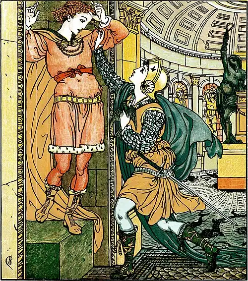 Prince Cheri at break of day perceived a handsome young man, from whom he learned where the singing-apple was to be found: but after travelling some time without seeing any sign of it, he saw a poor turtle-dove fall at his feet almost dead. He took pity on it, and restored it, when it said, "Good-day, handsome Cheri, you are destined to save my life, and I to do you signal service. You are come to seek for the singing-apple: it is guarded by a terrible dragon." The Dove then led him to a place where he found a suit of armour, all of glass: and by her advice he put it on, and boldly went to meet the dragon. The two-headed monster came bounding along, fire issuing from his throat; but when he saw his alarming figure multiplied in the Prince's mirrors he was frightened in his turn. He stopped, and looking fiercely at the Prince, apparently laden with dragons, he took flight and threw himself into a deep chasm. The Prince then found the tree, which was surrounded with human bones, and breaking off an apple, prepared to return to the Princess. She had never slept during his absence, and ran to meet him eagerly.
