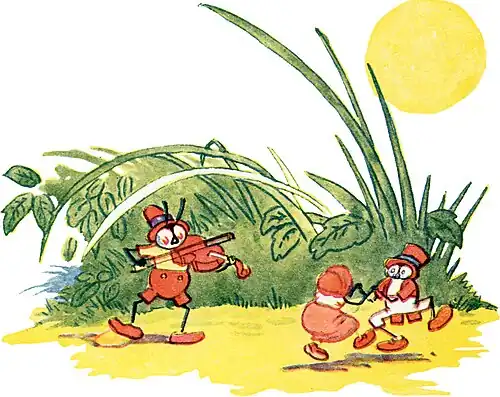 One night when the Lady Moon peeped over the tall grasses, Johnny Cricket said, “I ’spect I will play a nice, lovely tune on my fiddle.” So he tuned his fiddle, “tinky-tinky” and then began playing, oh, so happily.