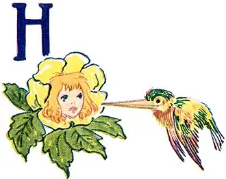 is for Humming Bird, dressed up so gay, Kissing the flowers he meets on the way.
