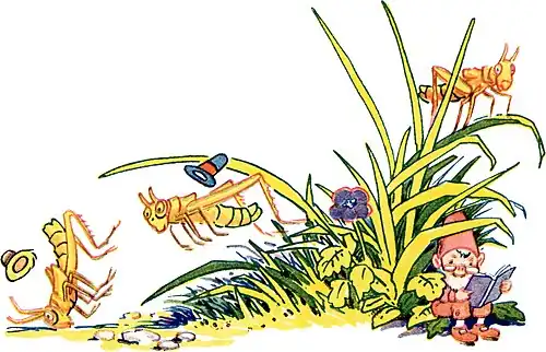 Have you ever watched Tommy Grasshopper jump? Tommy has two very long legs. He gives a kick and up in the air he goes. My! Tommy can jump far for such a weeny fellow. Wouldn't it be lots of fun to jump like that, if there was a nice springy hay stack to light upon? Tommy Grasshopper doesn’t mind though even if he does bump his head, he just gives another kick and tries to jump much farther. So, if anything does not go just as we like, we must do as Tommy Grasshopper does, try again and try much harder. Then, everything turns out ever so much happier.