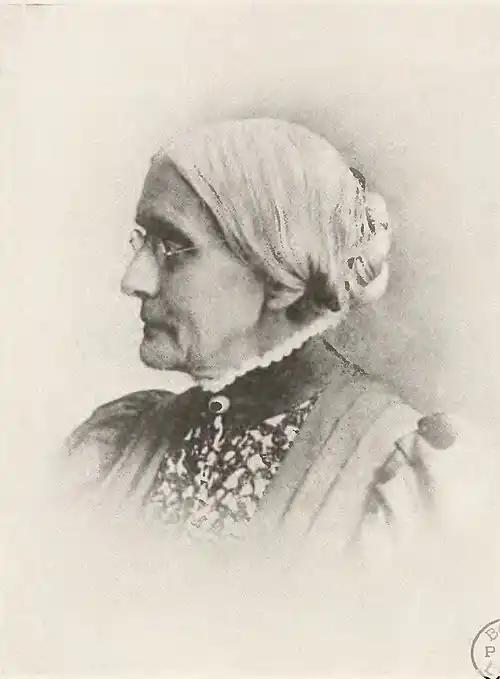 SUSAN B. ANTHONY, in virtue of her birth, her parentage, her six years of budding childhood passed at the foot of "Old Greylock" in the Berkshire range of hills, also through the residence of her ancestors in direct line, both maternal and paternal, with most if not all of their kith and kin, for seven generations, in Rhode Island or Southeastern or Western Massachusetts, may be justly claimed as a New England woman. Daughter of Daniel and Lucy (Read) Anthony, she was born at Adams, Mass., February 15, 1820, and was named for an aunt, Susan Anthony Brownell. The history of the family in America begins with the arrival at Portsmouth, R.I., in 1634, of John Anthony, a native of Hempstead, England, and then twenty-seven years of age. He served the colony as a Deputy, 1666-72. He had three sons—John, Jr., Joseph, and Abraham—and two daughters.