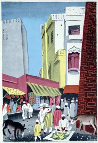 He wandered up and down and looked into all the little shops and open stalls that lined the packed and winding streets. Here and there he stopped to watch a man sitting cross-legged on the ground, sewing or weaving, or hammering on a piece of metal. He listened to the bright-colored parrots that hung in cages by the doorways and called to the tame monkeys that swung along the railings or dropped down from roof tops. He poked the lazy dogs that slept in the hot dust or snapped at the buzzing flies.