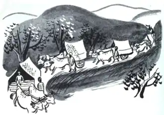 At night the oxen were unhitched and lay down beside the carts. Then Rhamon liked to help the men take the sweet-smelling hay from the lower parts of the wagons and feed the animals. After they were fed, fires were built all along the road and the men cooked their evening meal.