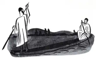 Suddenly he saw two men coming up the river, poling their boat very slowly and looking from side to side. Rhamon knew all the men of his own little village, but these were strangers. He wondered what they were doing, why they were going so slowly and looking around so carefully. He decided to watch them.