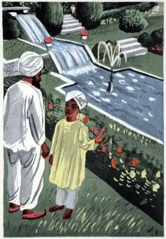 Subro answered, "Long ago, there was a noble Emperor named Jahanjir. He had a wife whom he loved with all his heart. To please' her he made this beautiful garden. And here they often came to spend happy hours together. Players and singers filled the air with music. Dancing girls entertained them, slaves waited on them. And so it is called the Garden of Happiness."