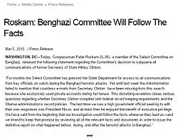 WASHINGTON, DC—Today, Congressman Peter Roskam (IL-06), a member of the Select Committee on Benghazi, released the following statement regarding the Committee's decision to subpoena all communications of former Secretary of State Hillary Clinton.